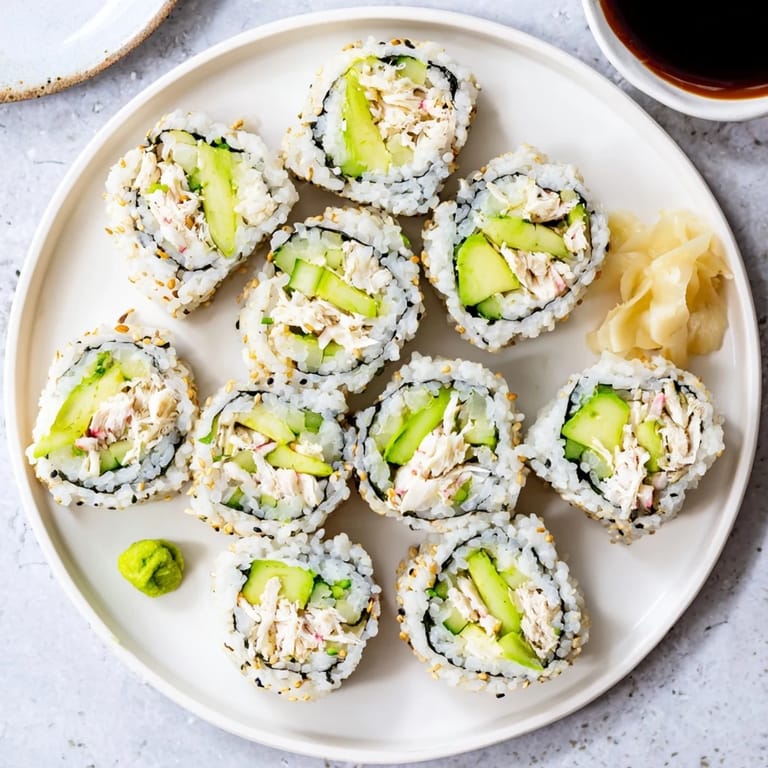 The California roll features an inside-out presentation where rice coats the exterior rather than being enclosed within nori. It combines crab, avocado, and cucumber—ingredients that were unconventional in traditional Japanese sushi when invented in Los Angeles during the 1960s.