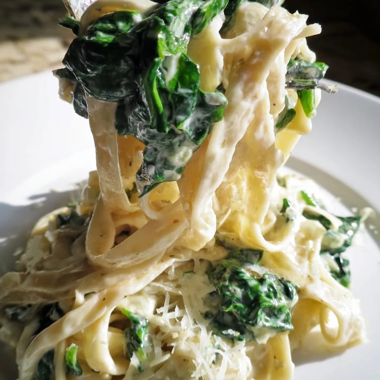 I made this for my sister once after she had a rough day, and she sat at my counter in silence for the first three bites, then asked if she could take the leftovers home. That's when I knew it wasn't just easy, it was the kind of easy that still tastes like care. The garlic mellows into the cream, the spinach wilts down to sweet, tender ribbons, and the Parmesan ties it all together with a nutty sharpness that keeps you coming back for one more forkful.