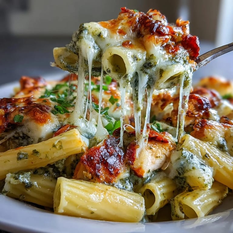 Save to Pinterest There's something about the smell of basil and melting cheese that transforms an ordinary Wednesday into something worth remembering. My neighbor brought over a casserole dish one evening with this exact combination, and I watched it come out of her oven with the cheese bubbling at the edges like tiny golden promises. That night, I stopped thinking of pesto as just a summer thing reserved for fresh pasta, and started seeing it as this year-round comfort that could hide in a baking dish and still manage to feel like celebration.
